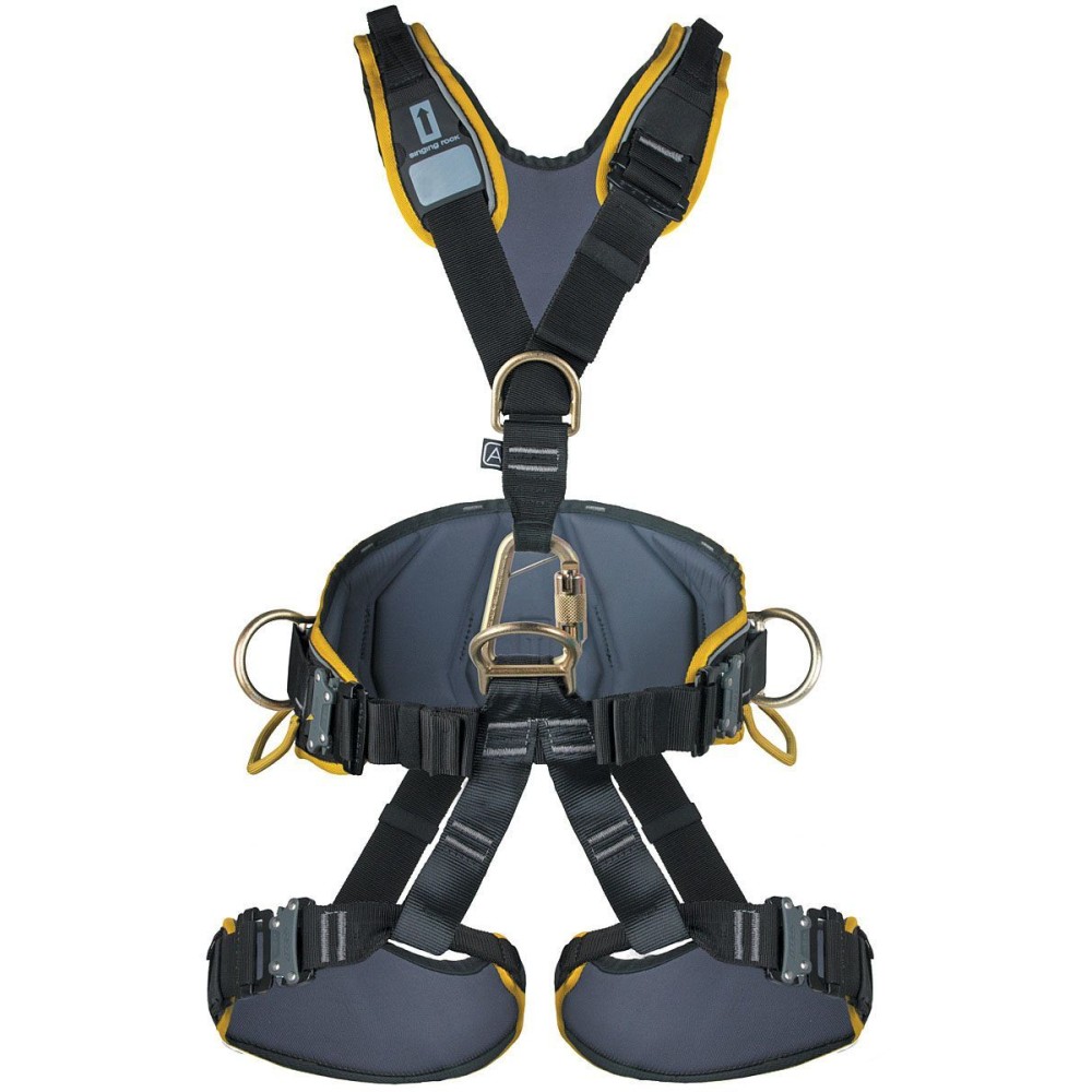 - Съёмные держатели строп на плечевых лямках позволяют хранить соединители страховочной линии; при падении соединитель автоматически освобождается для срабатывания амортизатора.