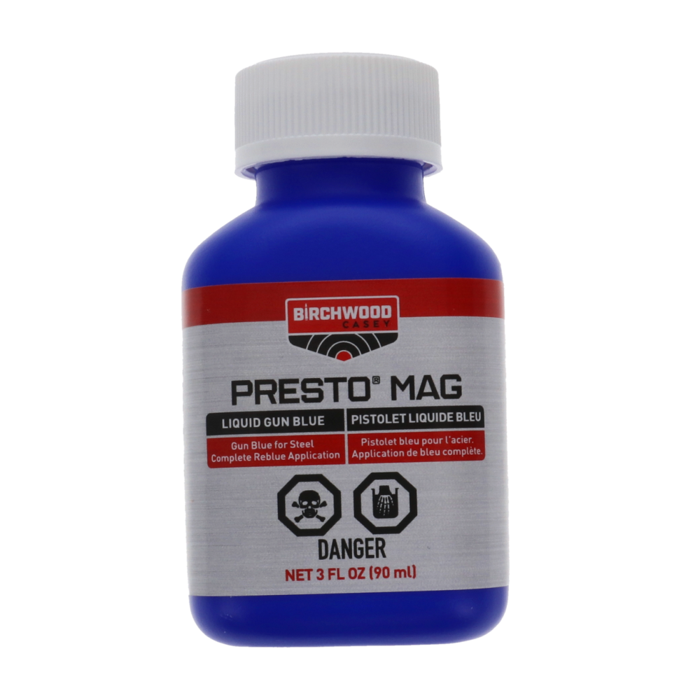 Presto® Mag Gun Blue — это холодное воронящее средство, которое подходит для всех видов стали (кроме нержавеющей). Специально разработано для случаев, когда требуется получить глубокий синеватый блеск на металлических поверхностях огнестрельного оружия.