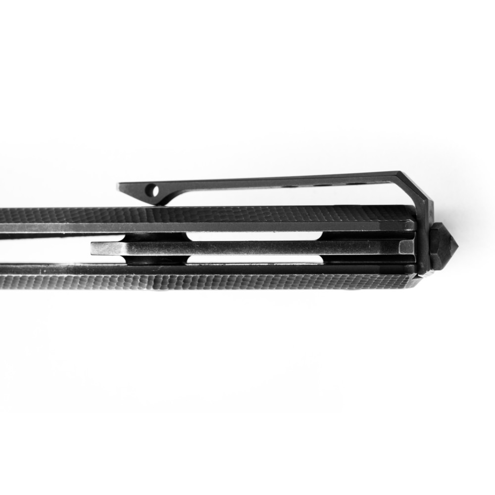 В линейке Myto представлены стильные и прочные ножи, которые, тем не менее, будут полезны каждый день. Стабильность обусловлена двумя рядами шарикоподшипников. Клинок выполнен из порошковой стали М390 и обработан черной галтовкой, поэтому нож выглядит, будто уже имеет за плечами некоторую историю. К титановому фрейму прикручена титановая клипса с помощью карбид-вольфрамового стеклобоя. Съемный флиппер.