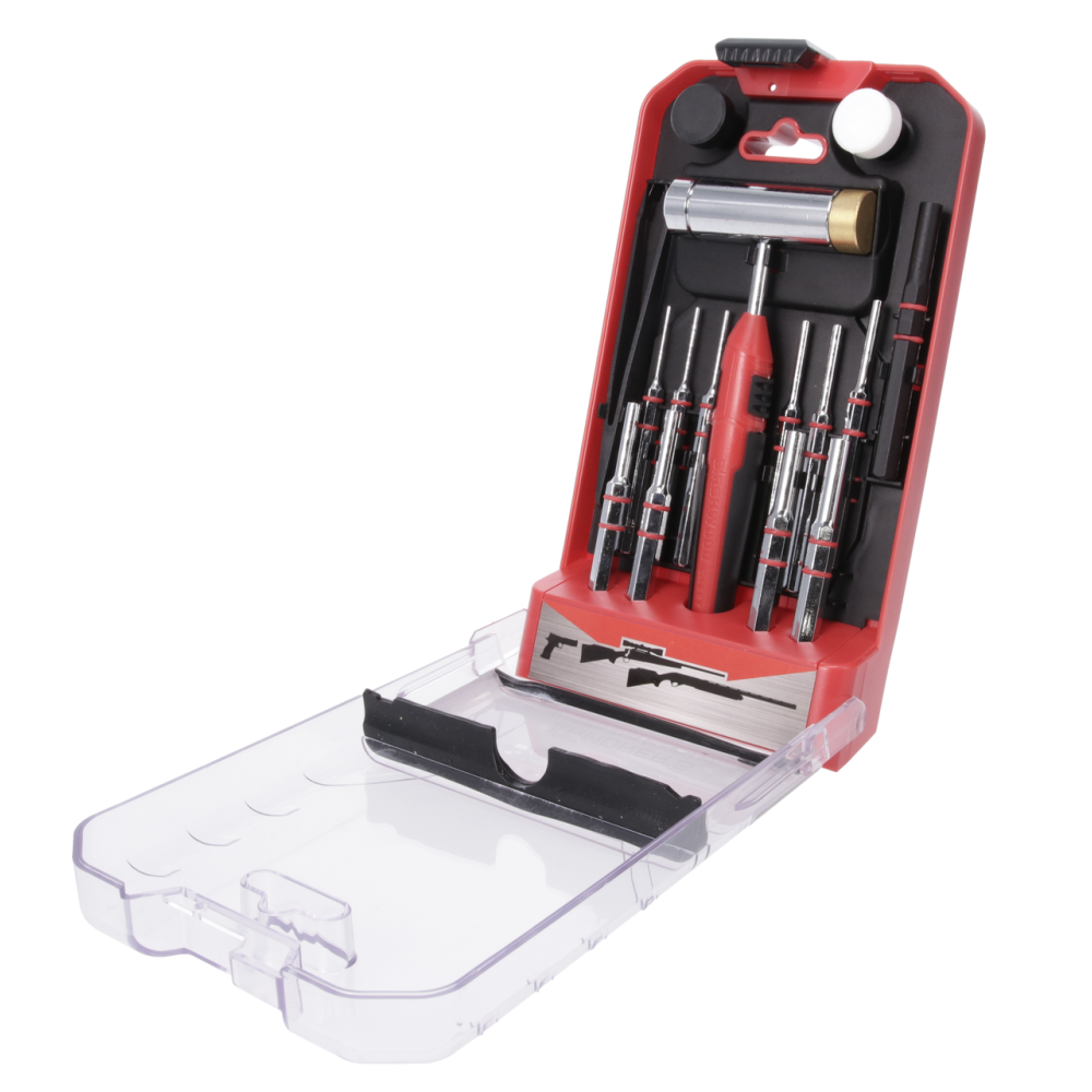 Набор инструментов Armorer's Hammer and Punch Kit включает молоток с двумя рабочими поверхностями и сменными насадками — стальной, латунной, нейлоновой и резиновой для универсального применения в разных задачах. В набор также входят 10 стальных выколоток размеров от 1/16" до 9/32" и одна смоляная выколотка 5/16". Дополнительно в комплект входит инструмент для выравнивания штифтов для точной работы и самоклеящаяся магнитная полоска для надежного удержания мелких металлических деталей. Встроенная подставка обеспечивает устойчивость при использовании, а крышка футляра может использоваться как лоток для деталей, обеспечивая удобство и порядок.