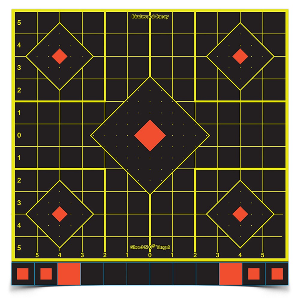 На каждом листе Shoot•N•C® 12" Sight-In расположено 5 мишеней — центральная используется для пристрелки, а четыре меньшие мишени позволяют тестировать разные баллистические нагрузки или подтверждать группы при пристрелке.